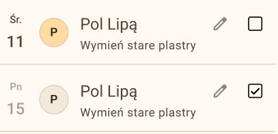 - Dodawanie zadań z poziomu pasieki: Kliknij kafelek wybranej pasieki. Wybierz Dodaj... -> Zadanie z dolnego menu. Wprowadź treść zadania, wybierz datę i czy powtarzać zadanie. Zapisz żółtym przyciskiem. Zadanie zostanie zapisane dla wszystkich uli (całej pasieki).